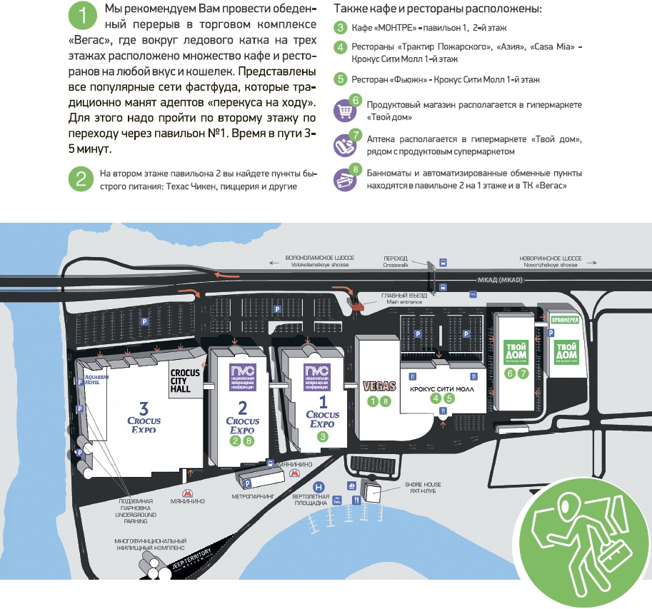 На общественном транспорте: Крокус Экспо находится на станции метро Мякинино Арбатско-Покровской линии (это темно-синяя линия). Выход к павильонам выставочного центра